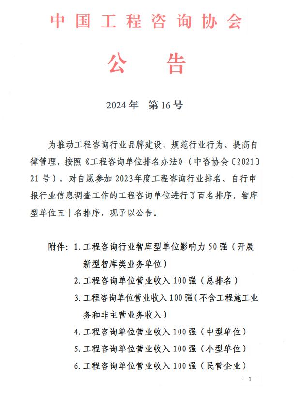 | 公司再次榮登全國工程咨詢單位營業(yè)收入100強榜單作者:admin 來源: 日期:2024-11-12 15:02:42 人氣: